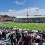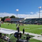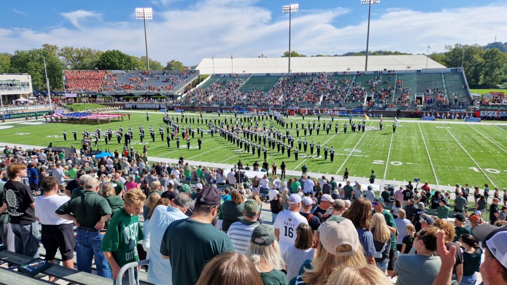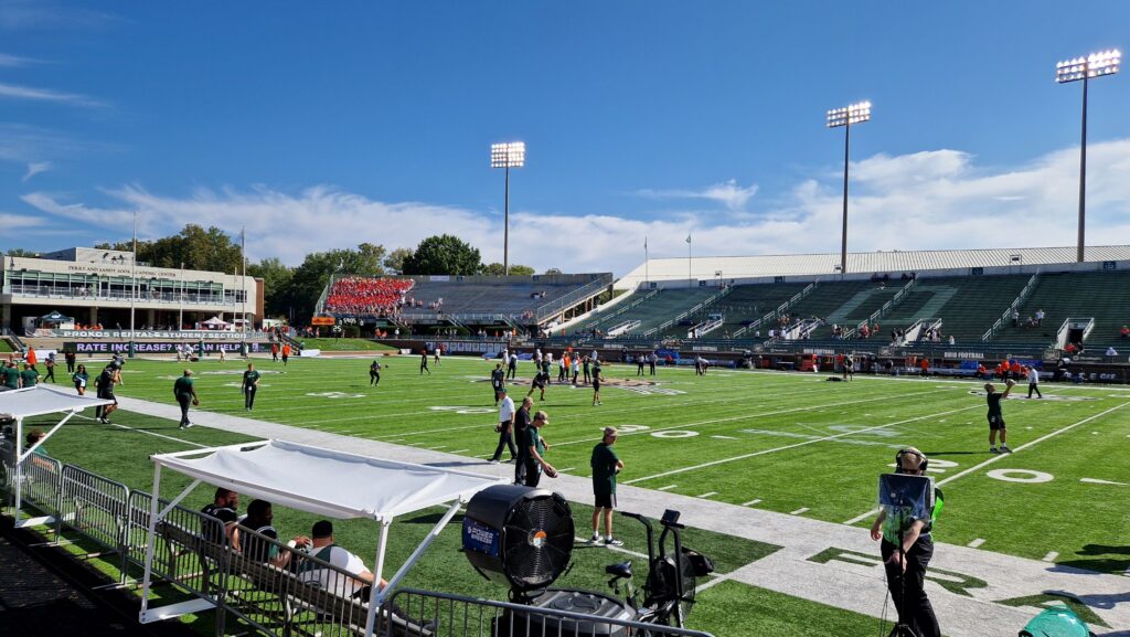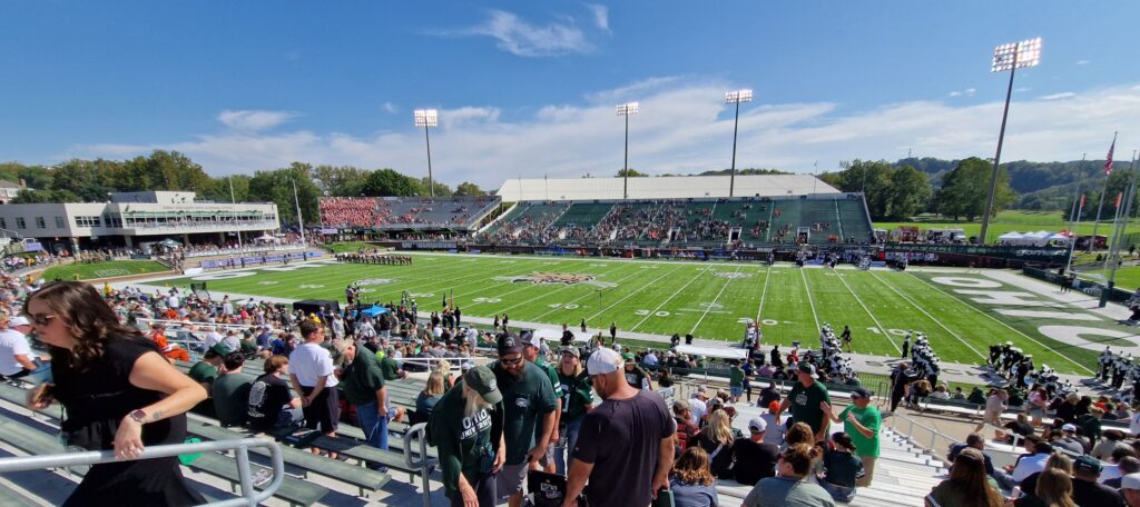 Ich habe das auf 12 Uhr Mittags angesetzte American Football Spiel besucht. In den USA sind die Universitätsmannschaften in verschiedene Gruppen unterteilt. Die Ohio Bobcats spielen in einer Gruppe welche MAC heisst. Daneben gibt es z.B. auch Big 12, SEC, Big ten, Pac-12, ACC und mehr. Das ganze System ist recht komplex, da auch quer durch die verschiedenen Gruppen gegeneinander gespielt wird. Deshalb gibt es auch viele „Meister“ und Finalspiele, welche hier „Bowl“ heissen.